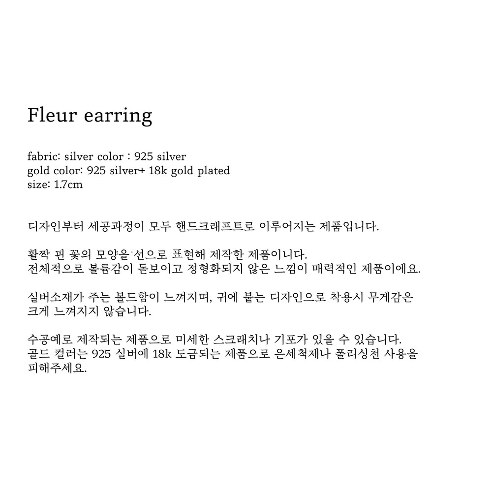 (핸드메이드 제품의 특성상 모든 마감처리가 균일하기 어렵습니다./ 주물로 작업하는 은 제품 특성상 기포나 스크래치가 있을 수 있습니다. / 은침 제품의 경우 무른 은의 특성상 배송과정이나 포장을 뜯는 과정에서 휘어짐이 발생할 수 있습니다./