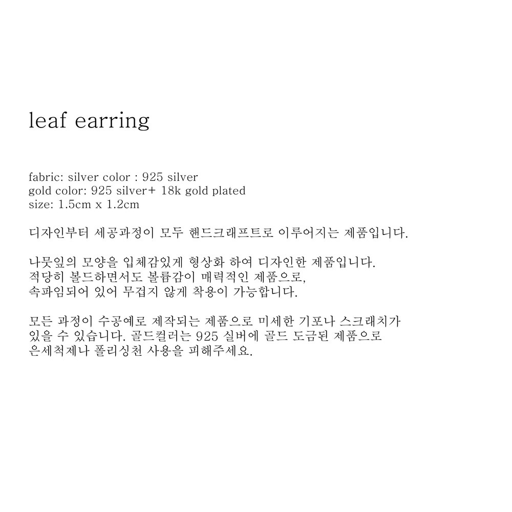 (핸드메이드 제품의 특성상 모든 마감처리가 균일하기 어렵습니다./ 주물로 작업하는 은 제품 특성상 기포나 스크래치가 있을 수 있습니다. / 은침 제품의 경우 무른 은의 특성상 배송과정이나 포장을 뜯는 과정에서 휘어짐이 발생할 수 있습니다./